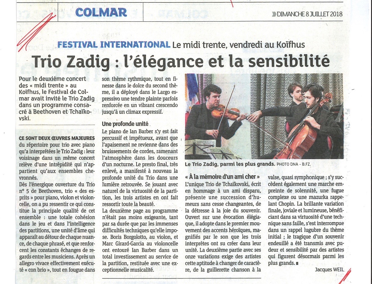 Pour ce concert, le Trio Zadig a également reçu une très belle critique de Jacques Weil du journal L'Alsace : "Une exceptionnelle musicalité (...) Des artistes qui figurent désormais parmi les grands."